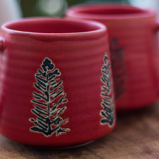 Handcrafted Red Ceramic Mugs with Leaf Design, Set of 2