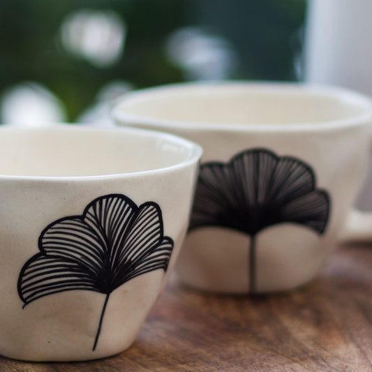 Handcrafted Ceramic Mugs with Black Flower Design, Set of 2