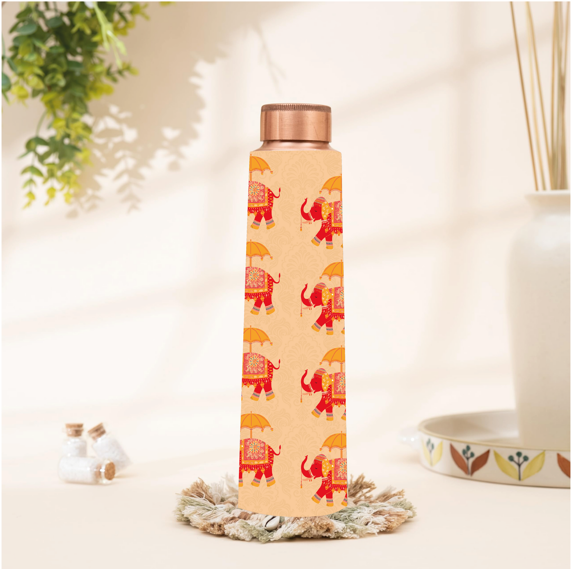 Rare Planet Copper Water Bottle with Royal Elephant Print Design. Crafted from 100% pure copper, this 1-liter Ayurvedic bottle is designed to promote wellness by naturally purifying water and balancing the body's doshas – Vata, Pitta, and Kapha. The elegant elephant print reflects traditional Indian art, making it a beautiful and functional accessory for your daily routine. Ideal for office, home, yoga, or travel, this eco-friendly and BPA-free bottle is also leakproof, ensuring zero spills on the go. Whether you're embracing a healthy lifestyle or searching for a unique gift, this handcrafted copper bottle blends heritage with purpose. Choose Rare Planet and support Indian artisans while making a sustainable, stylish choice for your wellness journey.