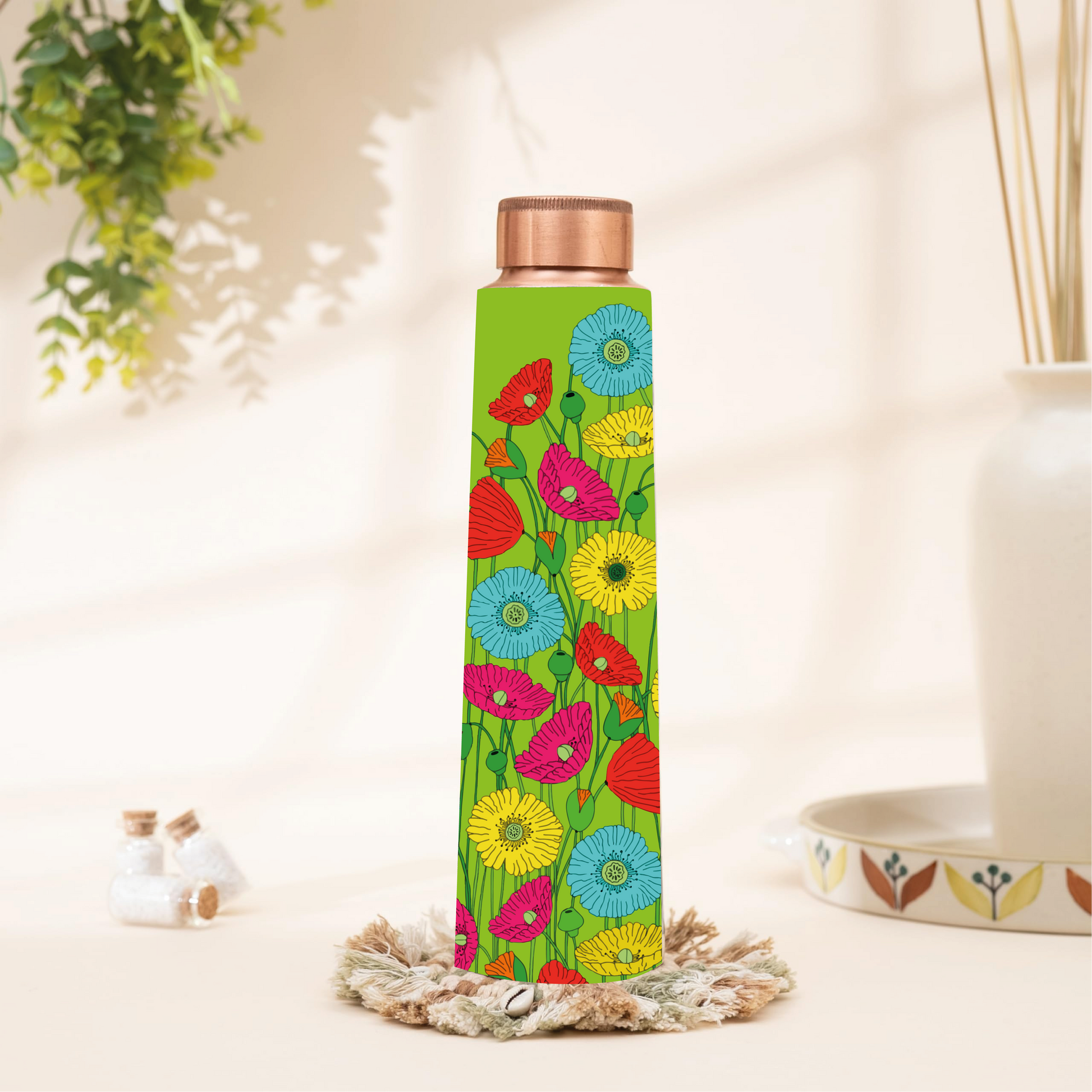 Stay refreshed in style with the Rare Planet Copper Water Bottle with Colourful Floral Print. Made from 100% pure copper, this 1-litre Ayurvedic copper bottle naturally enhances water with health-boosting properties—supporting digestion, improving immunity, and balancing pH levels. The vibrant, hand-painted floral design adds a touch of elegance, making it perfect for use at home, office, yoga, or travel. Its leakproof and BPA-free construction ensures safe, mess-free hydration wherever you go. An eco-friendly and reusable choice, this traditional Indian copper water bottle is a thoughtful gift for those who value both wellness and sustainable living. Easy to clean and built to last, it combines time-tested Ayurvedic benefits with modern design sensibilities.
