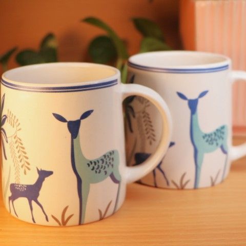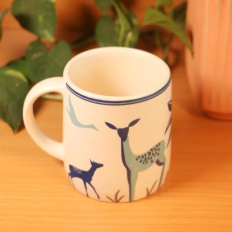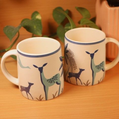Discover our exquisitely handcrafted ceramic mugs, featuring a captivating wildlife design that brings a touch of nature's serenity to your morning routine. These mugs showcase an intricate pattern of deer and foliage in soothing blue tones, perfectly set against a creamy background. The artistic design is inspired by the rich traditions of Indian craftsmanship, making each piece a unique work of art.