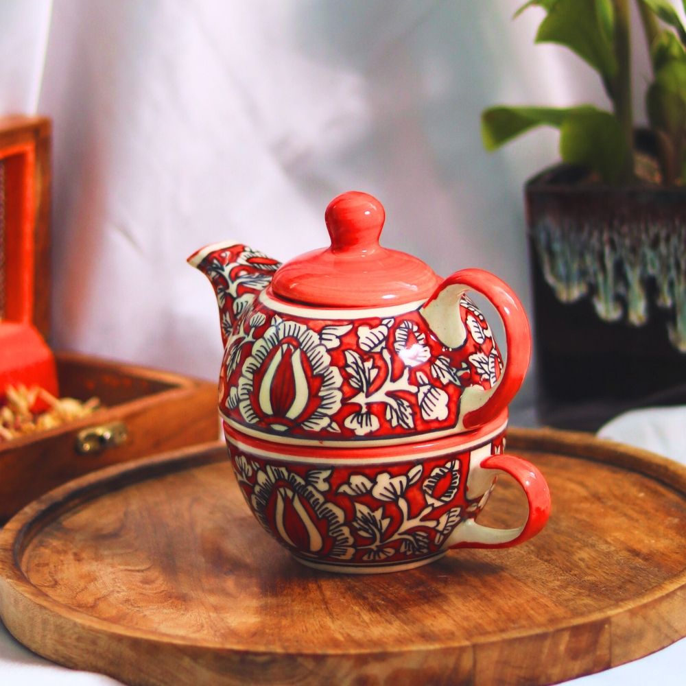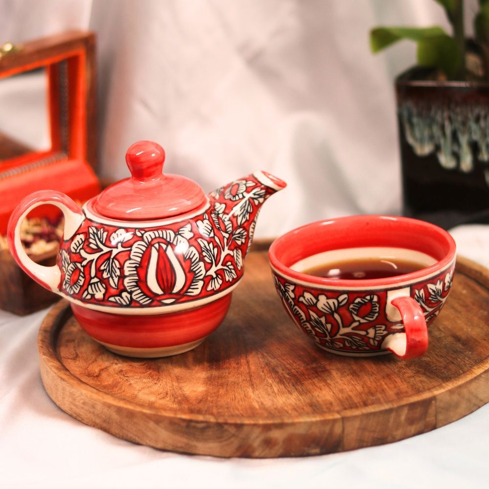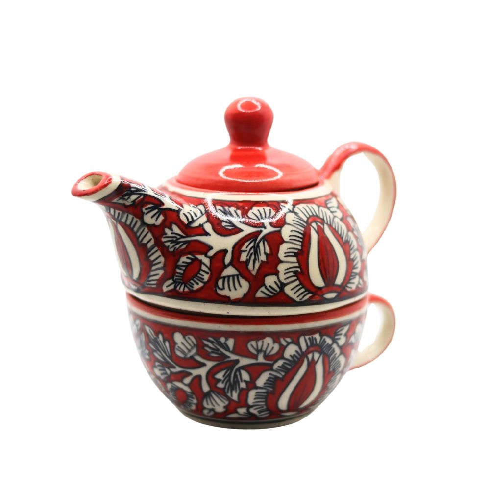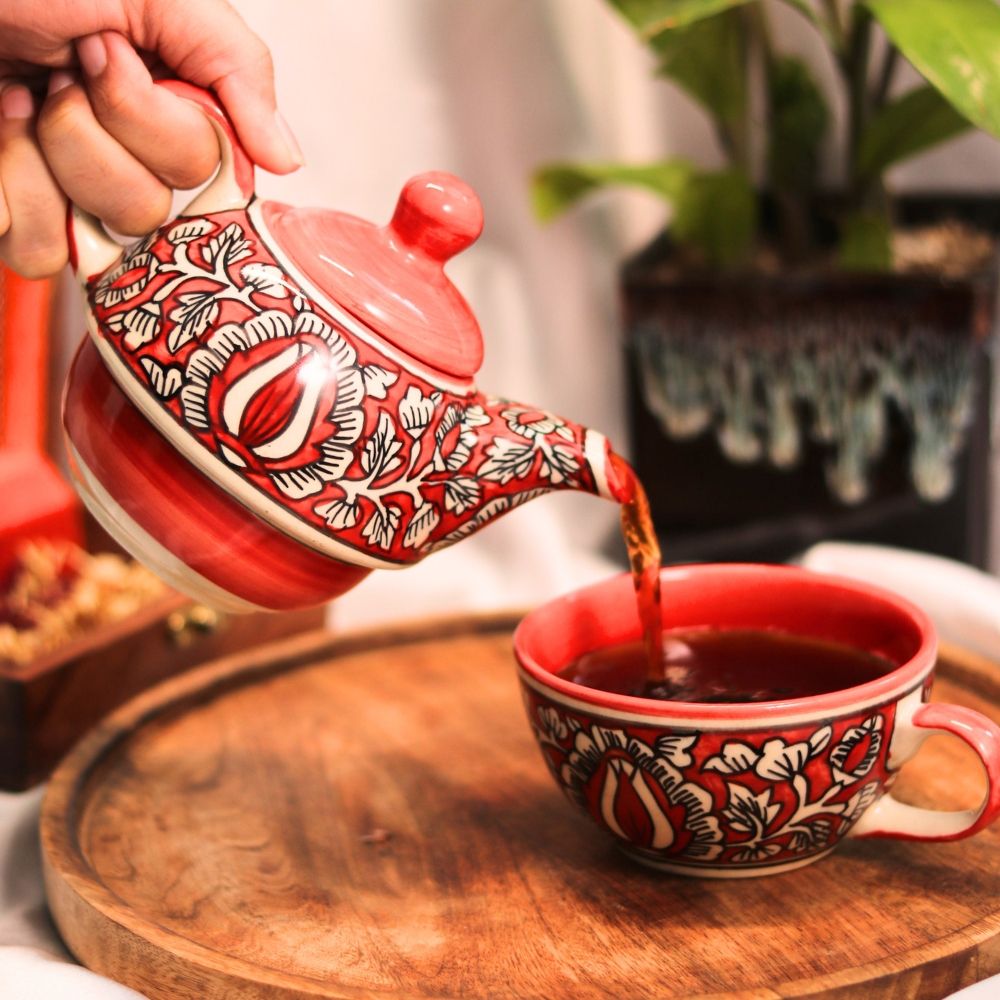 Handcrafted Ceramic Floral Teapot Set - Red and White