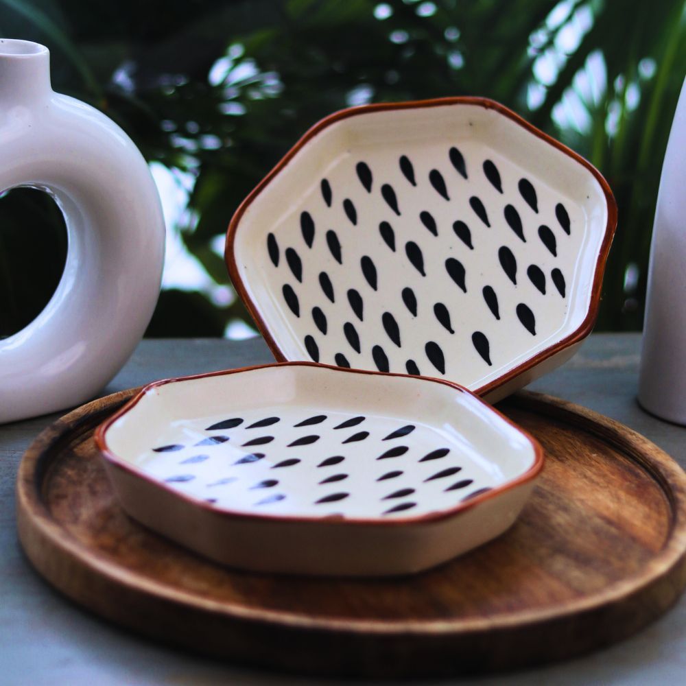 Handcrafted Ceramic Plates Set of 2 with Black Teardrop Pattern