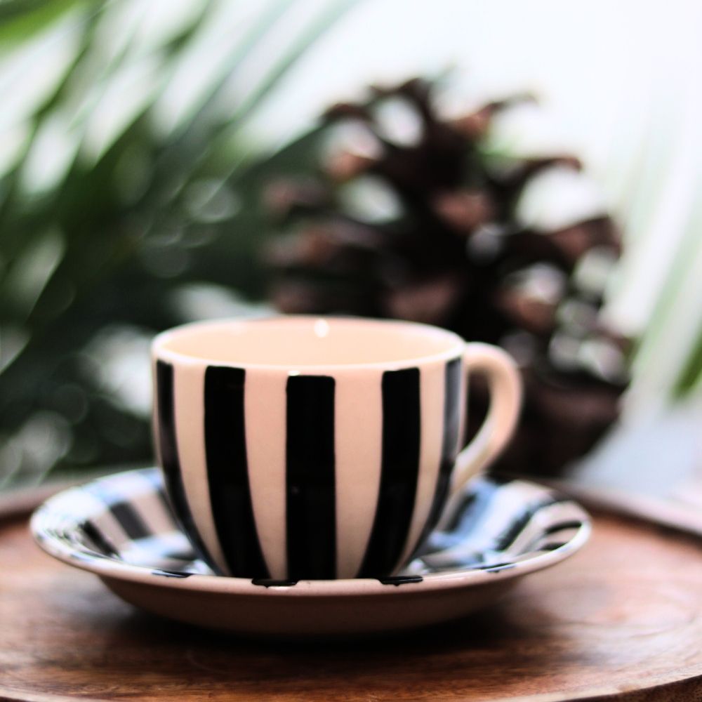 Striped Ceramic Coffee Cup and Saucer Set - Black & White